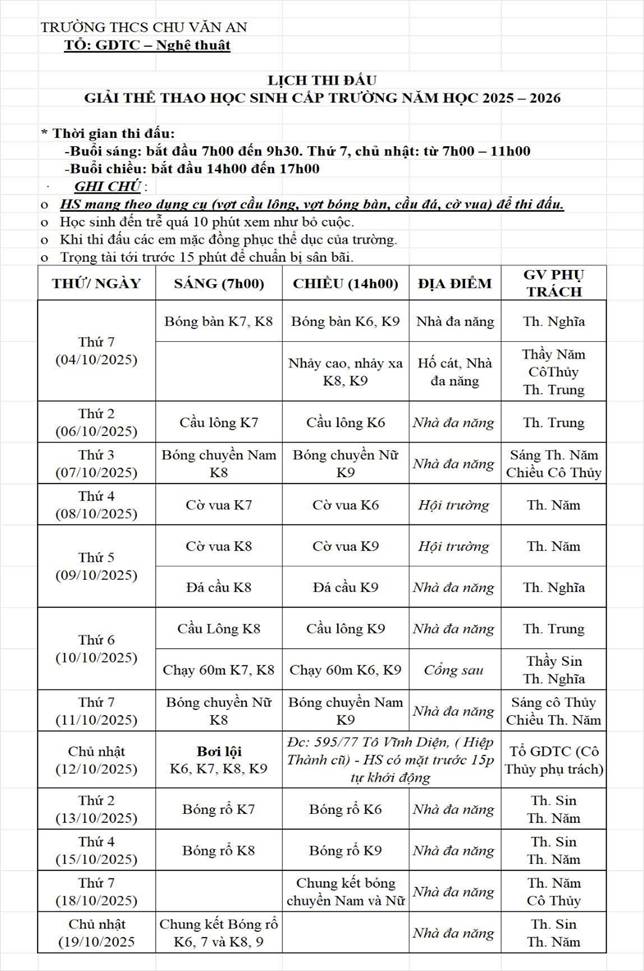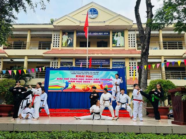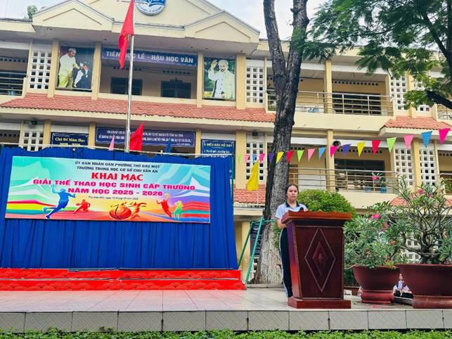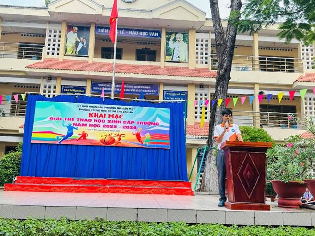 Thực hiện Kế hoạch Giáo dục năm học 2025 – 2026 của Trường THCS Văn An, phường Thủ Dầu Một, Thành phố Hồ Chí Minh; được sự chỉ đạo của Ban Giám hiệu Nhà trường, sáng thứ 2-13-10-2025, Tổ Giáo dục thể chất – Nghệ thuật phối hợp với Liên đội Trường THCS Chu Văn An tổ chức buổi Khai mạc Giải Thể thao học sinh năm học 2025 – 2026 cấp Trường cho các em học sinh ở các khối lớp.