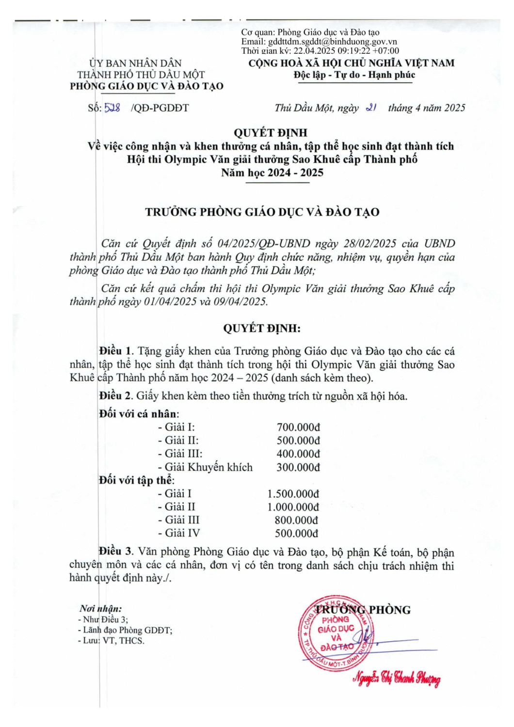 Công nhận và khen thưởng cá nhân, tập thể học sinh đạt thành tích Hội thi Olympic Văn giải thưởng Sao Khuê cấp Thành phố - NH 2024-2025