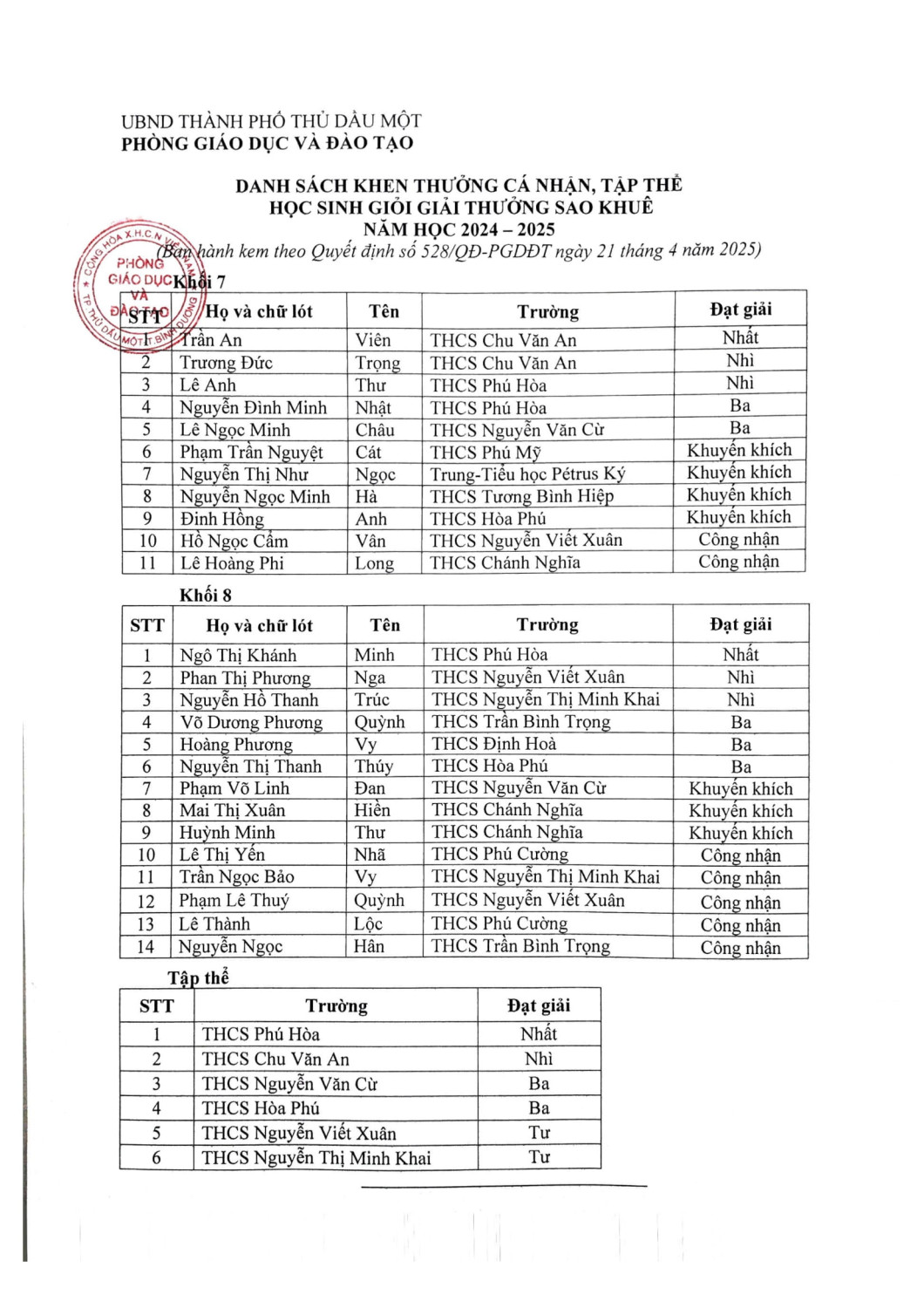 CÔNG NHẬN VÀ KHEN THƯỞNG CÁ NHÂN, TẬP THỂ HỌC SINH ĐẠT THÀNH TÍCH HỘI THI OLYMPIC VĂN GIẢI THƯỞNG SAO KHUÊ CẤP THÀNH PHỐ