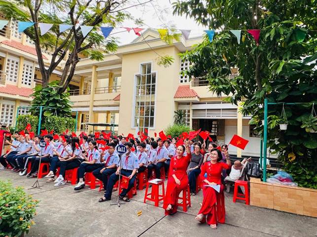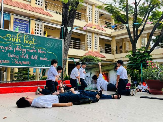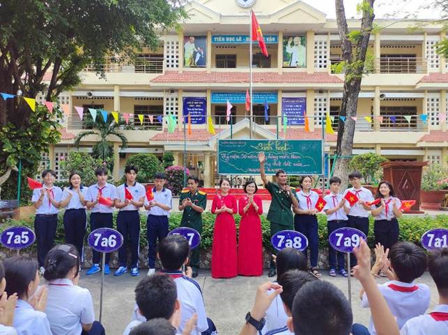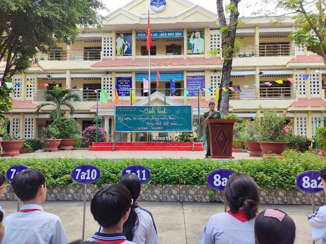Tiết mục văn nghệ của các em học sinh lớp 6A13 mở đầu tiết sinh hoạt thay cho lời chào Tổ quốc, lời tri ân các anh hùng liệt sĩ đã hi sinh thân mình vì độc lập dân tộc. Tiếp đến là câu chuyện đầy xúc động về người anh hùng Phan Đình Giót – lấy thân mình lấp lỗ châu mai – qua lời kể của em Trương Đức Trọng – học sinh lớp 7A12. Câu chuyện như khúc tráng ca ca ngợi người anh hùng dũng cảm, mưu trí, sẵn sàng xả thân chiến đấu vì độc lập, tự do cho dân tộc. Từ đó, thôi thúc học sinh ra sức học tập, trui rèn đạo đức; biết nuôi dưỡng tinh thần yêu nước, tinh thần dân tộc, trở thành người công dân có ích cho xã hội, góp phần dựng xây và phát triển đất nước trong tương lai.
