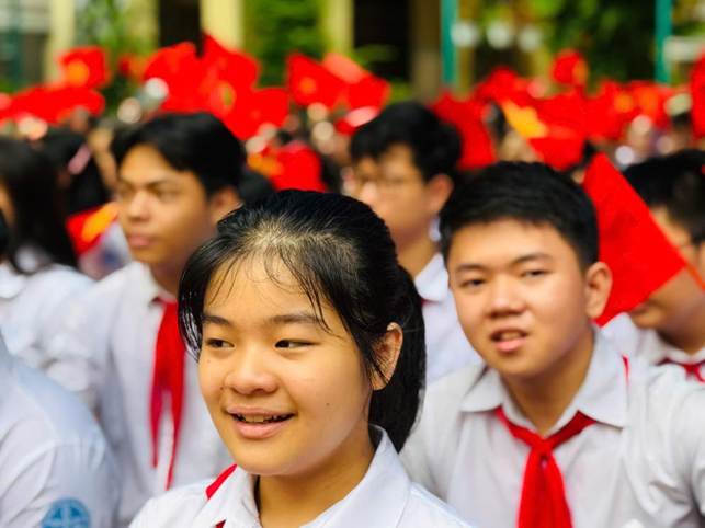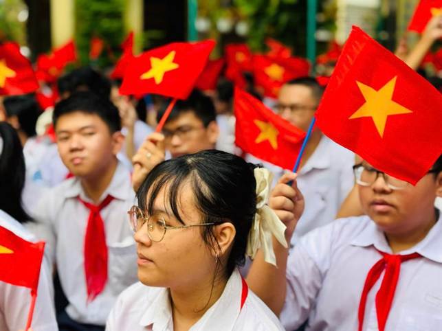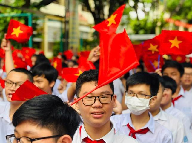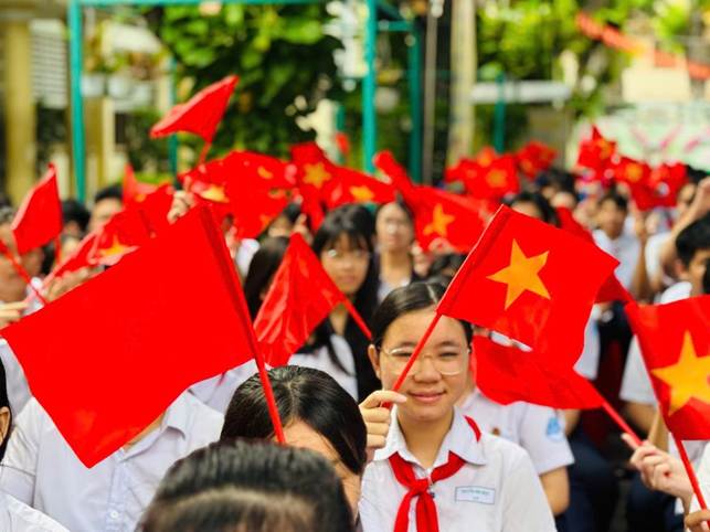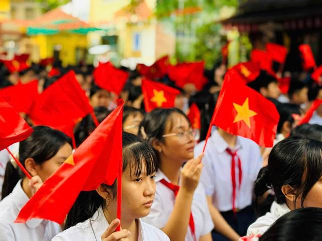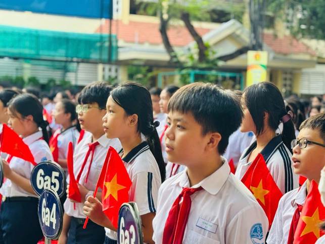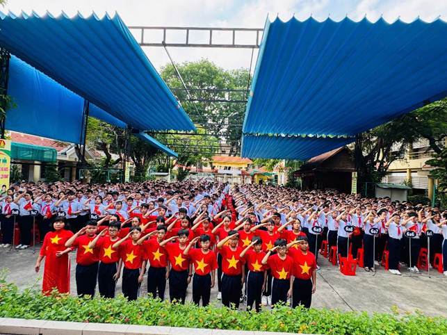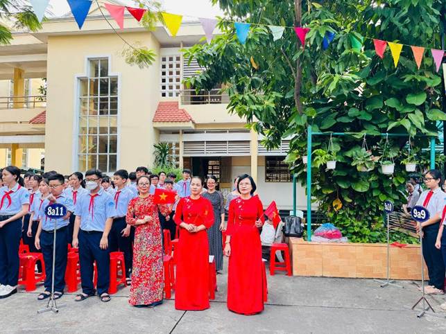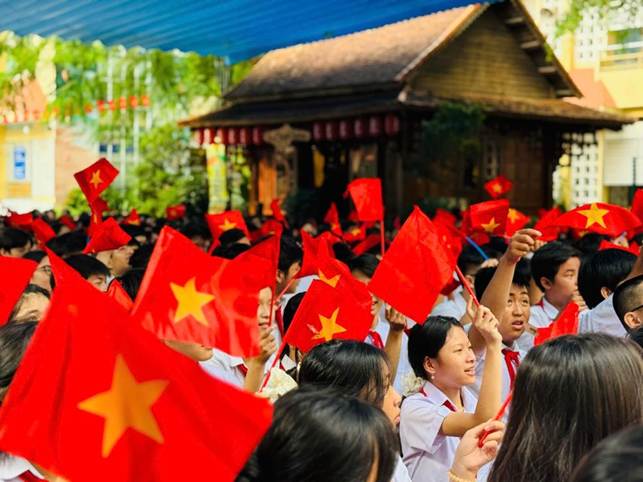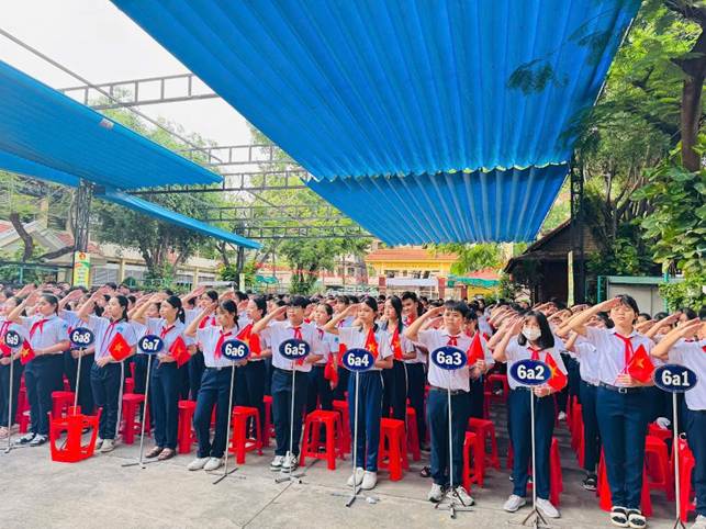 Dưới lá Quốc kỳ đỏ thắm, bài hát Quốc ca thiêng liêng ngân lên theo tiếng nhạc, tay phải hướng lên lá cờ, tay trái cầm lá cờ Tổ quốc đầy tự hào, nghi thức lễ chào cờ trang nghiêm của tập thể thầy trò Trường THCS Chu Văn An diễn ra thật xúc động.