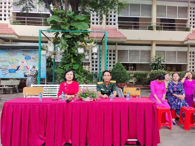 Về dự tiết sinh hoạt chuyên đề có bác Nguyễn Tiến Song – Hội Cựu chiến binh phường Hiệp Thành – báo cáo viên; cô Diệp Thị Ngọc Dung – Bí thư Chi bộ - Hiệu trưởng Nhà trường, cô Lâm Thị Mỹ Hương – Phó Bí thư Chi bộ - Phó Hiệu trưởng Nhà trường, cô Nguyễn Thị Lan – Phó Hiệu trưởng Nhà trường, các thầy cô giáo chủ nhiệm ở các khối lớp và các em học sinh khối sáng và chiều.