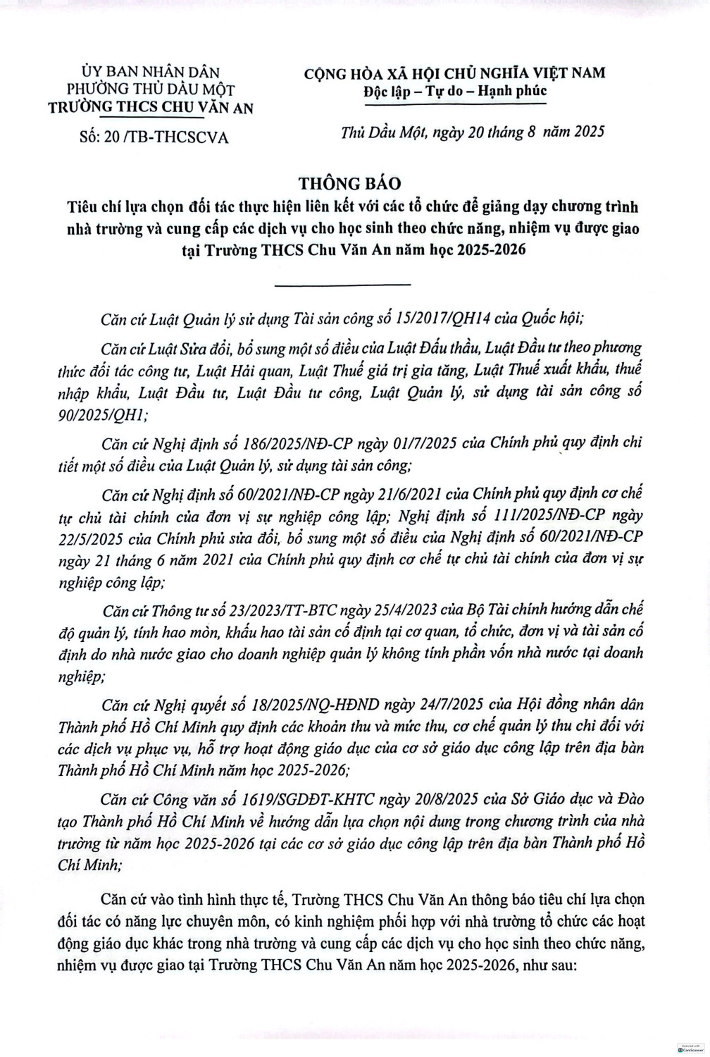 Thông báo Tiêu chí lựa chọn đổi tác thực hiện liên kết với các tổ chức để giảng dạy chương trình nhà trường và cung cấp các dịch vụ cho học sinh theo chức năng, nhiệm vụ được giao tại Trường THCS Chu Văn An năm học 2025-2026