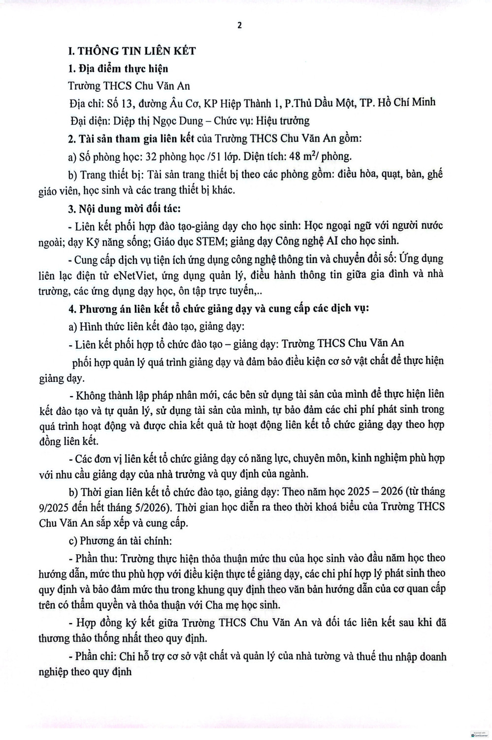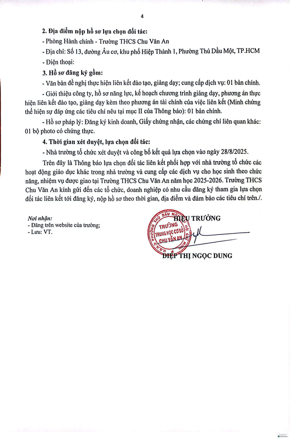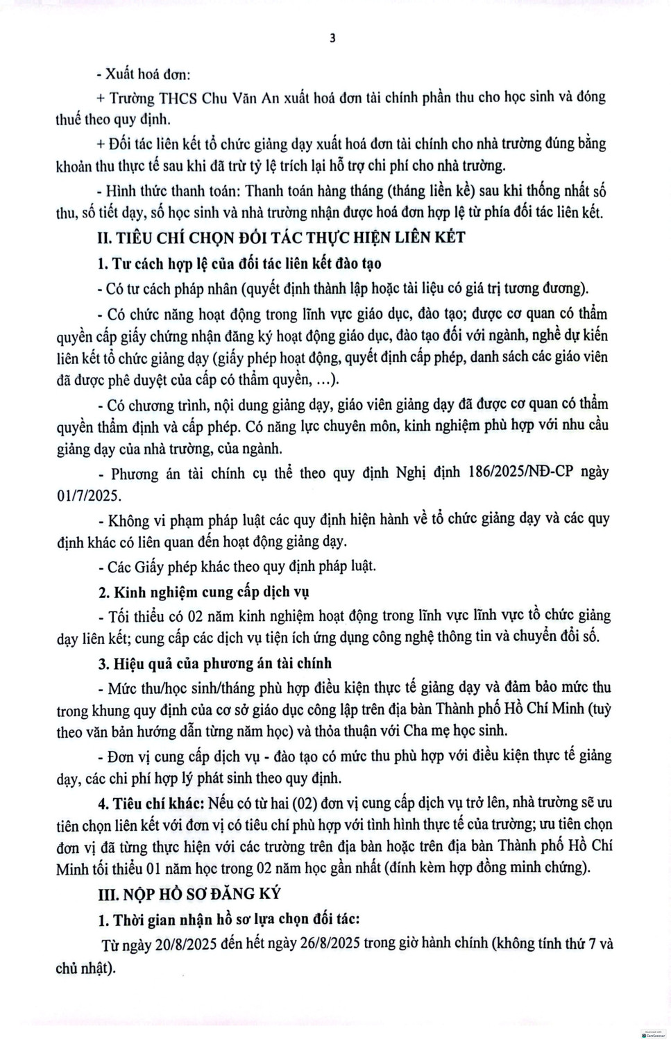 Thông báo Tiêu chí lựa chọn đổi tác thực hiện liên kết vói các tổ chức để giảng dạy chương trình nhà trường và cung cấp các dịch vụ cho học sinh theo chức năng, nhiệm vụ được giao tại Trường THCS Chu Văn An năm học 2025-2026