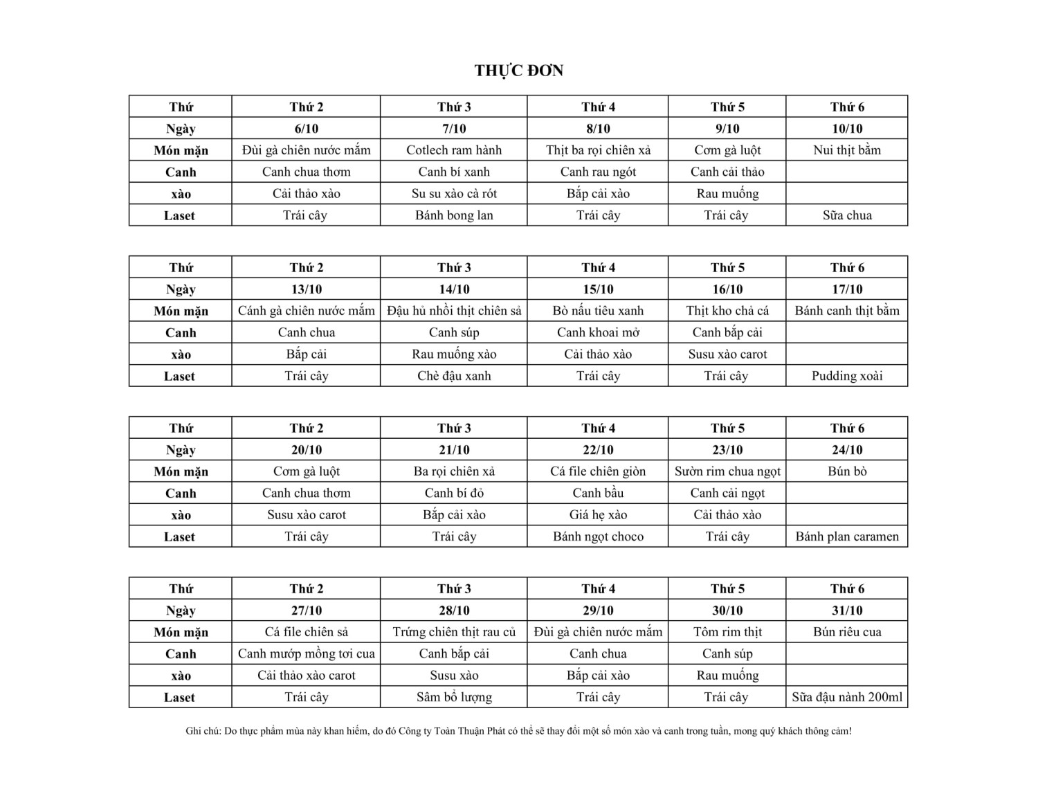 THỰC ĐƠN BÁN TRÚ THÁNG 10