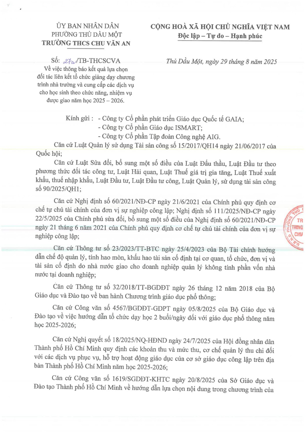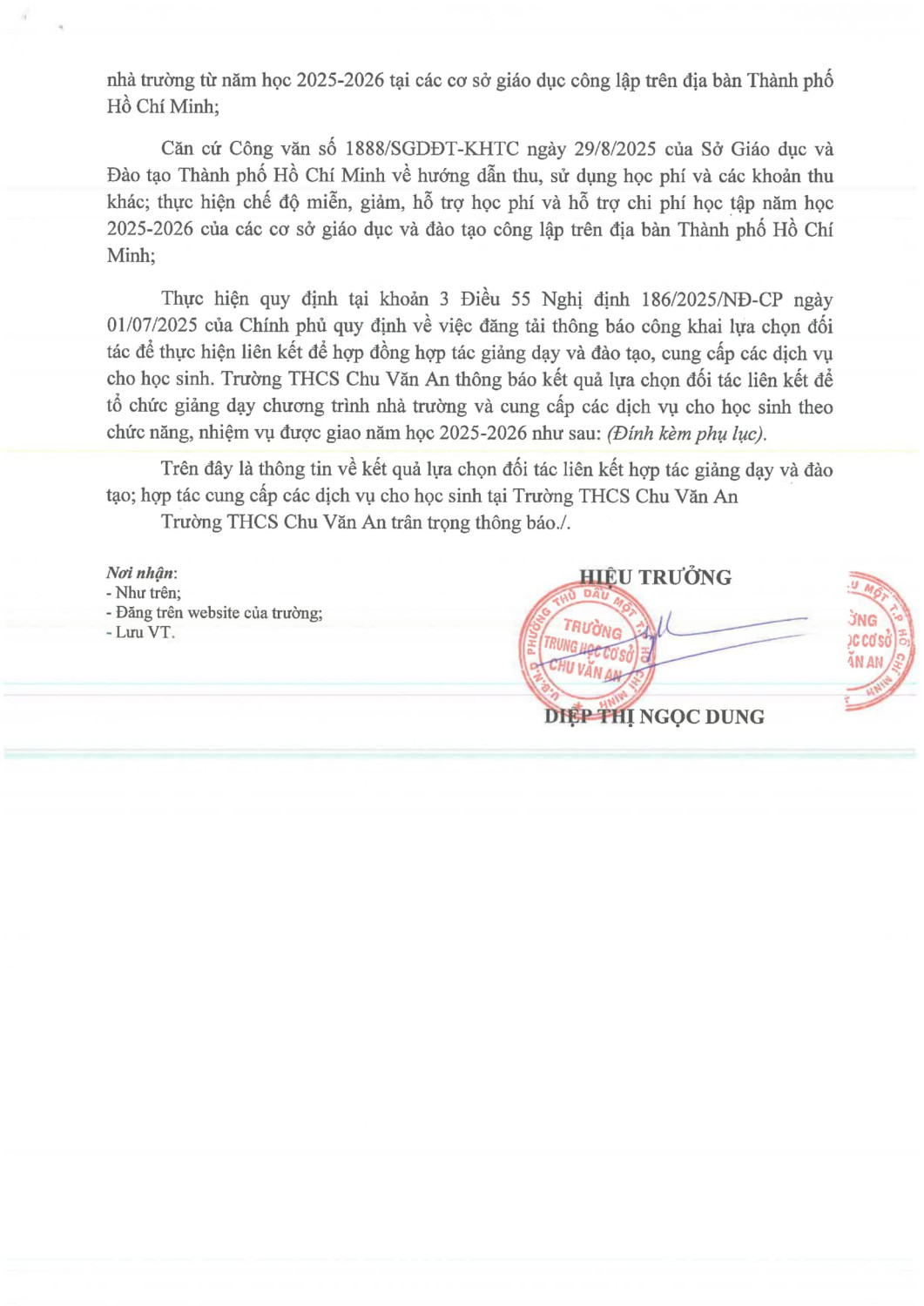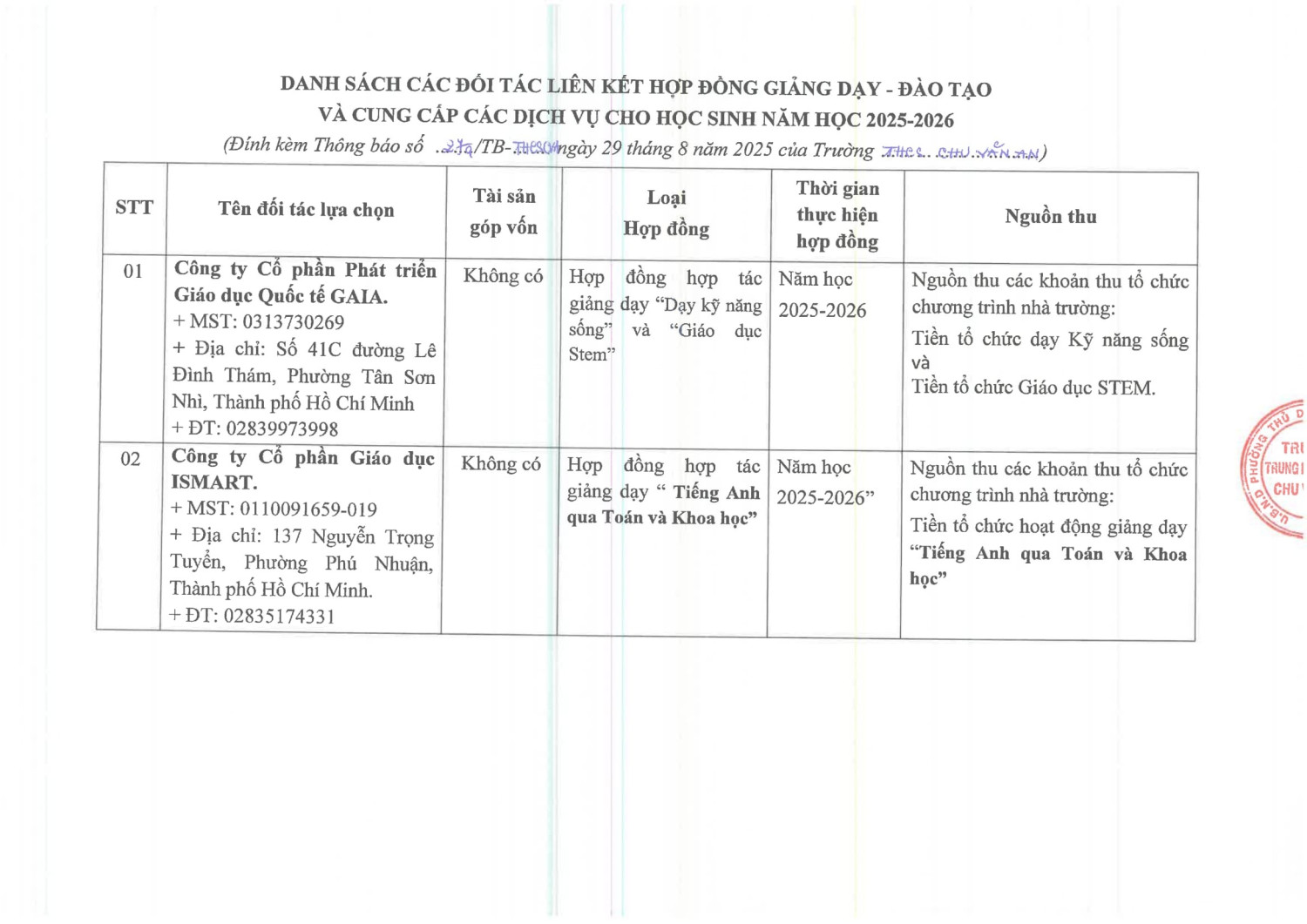 THÔNG BÁO KẾT QUẢ LỰA CHỌN ĐỐI TÁC LIÊN KẾT TỔ CHỨC GIẢNG DẠY NĂM HỌC 2025-2026